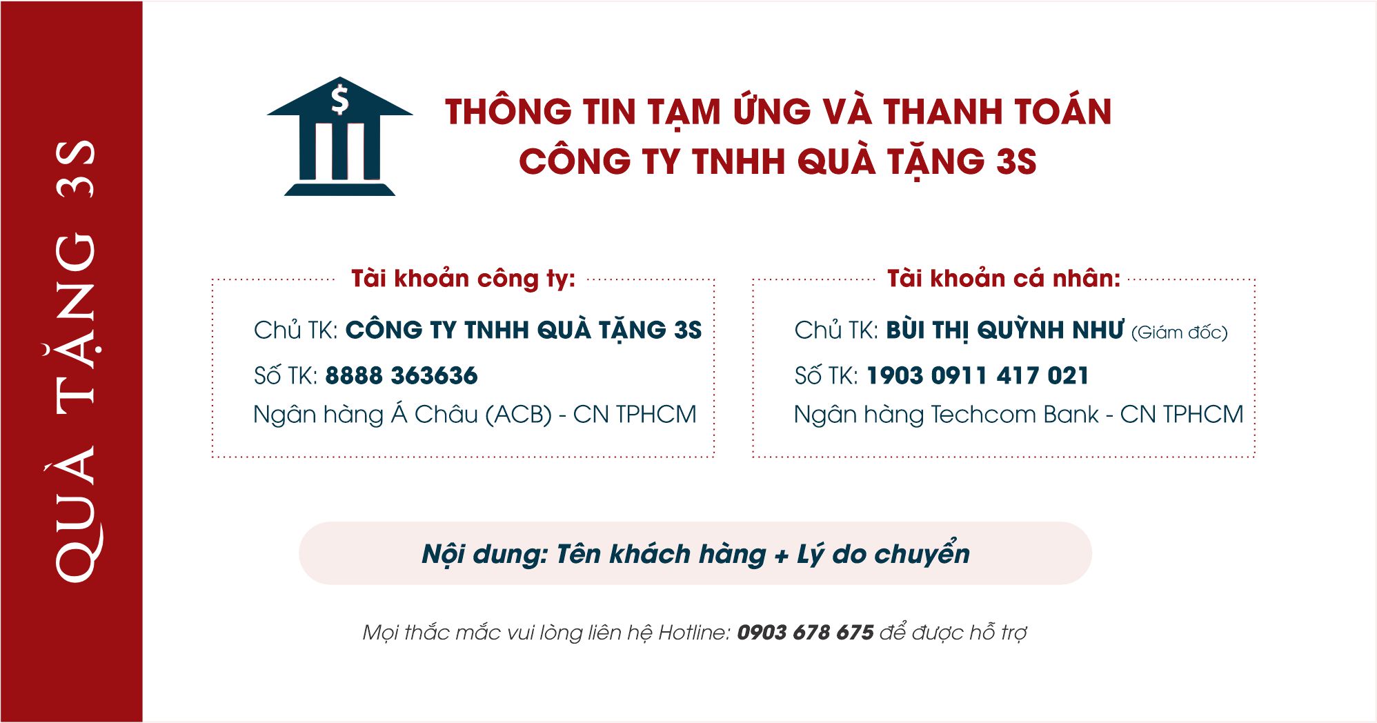 • Quý khách hàng tạm ứng 50% tổng giá trị đơn hàng ngay khi ký HĐ đặt hàng tại Quà Tặng 3S
